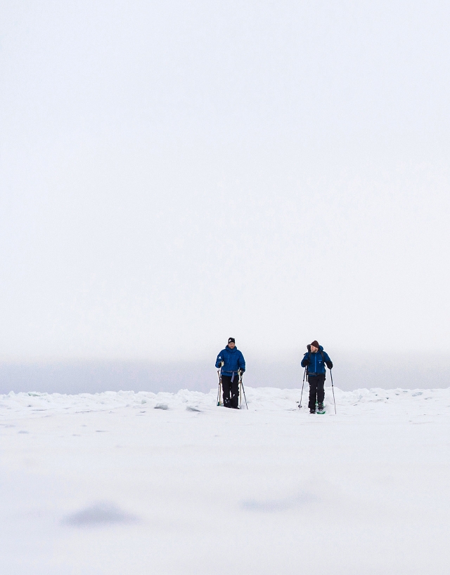 Efter att ha plöjt sig igenom den till synes eviga isen under en tid, vänder Arctic Explorer tillbaka mot fastlandet. Vi stannar till i en enorm bukt täckt av is för nästa äventyr på resan. En landgång fälls ut och landar på isen med en smäll och snart får vi, en och en gå ”iland” för att vandra omkring på den tjocka isen. Snart myllrar det av turister på det frusna havet, turister som häpnar över känslan att vandra på vatten.